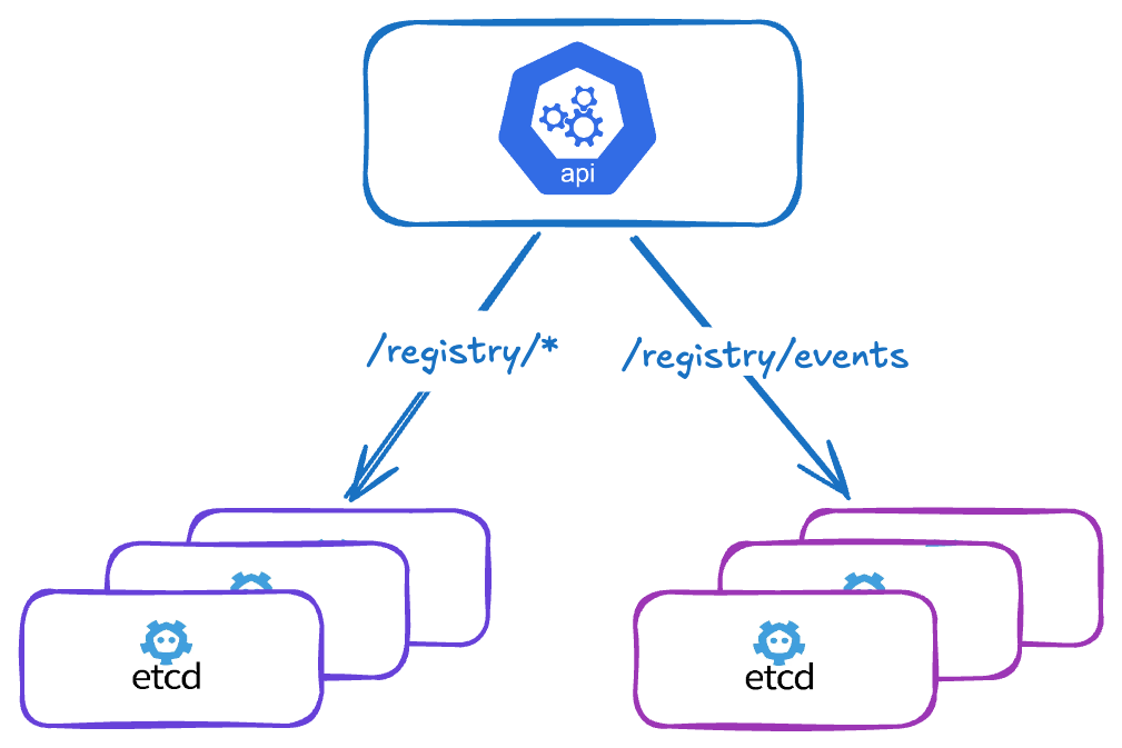 Kubernetes allows redirecting certain keys to a separate etcd cluster via the kube-apiserver flag: